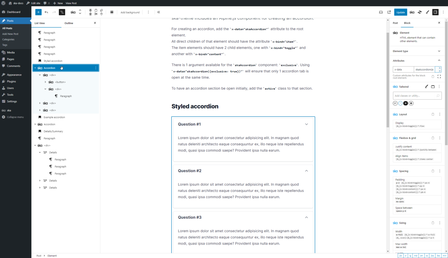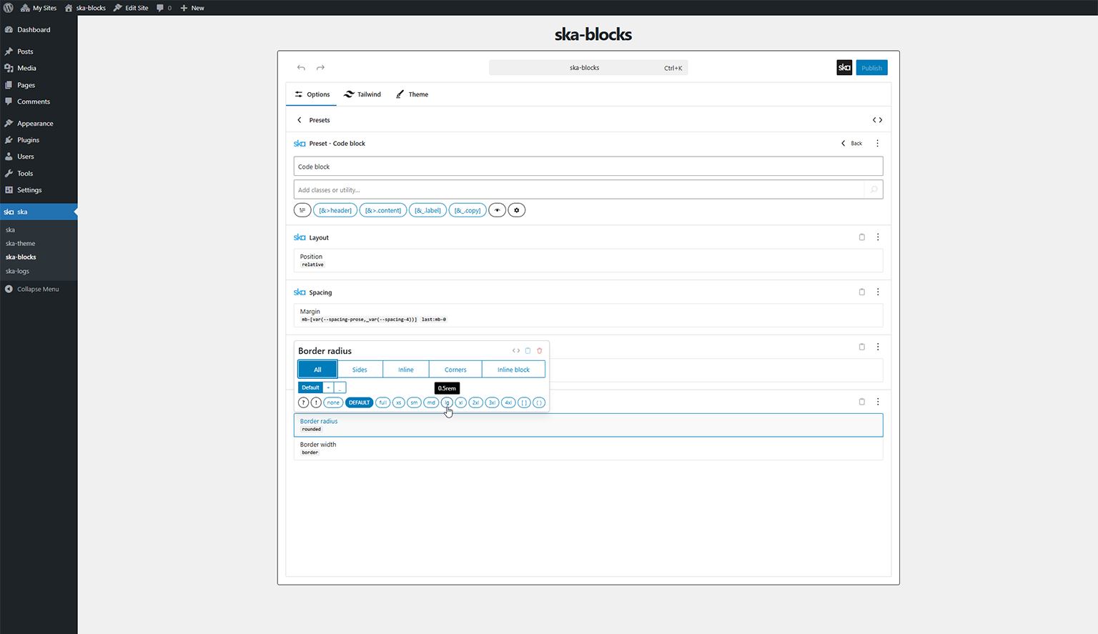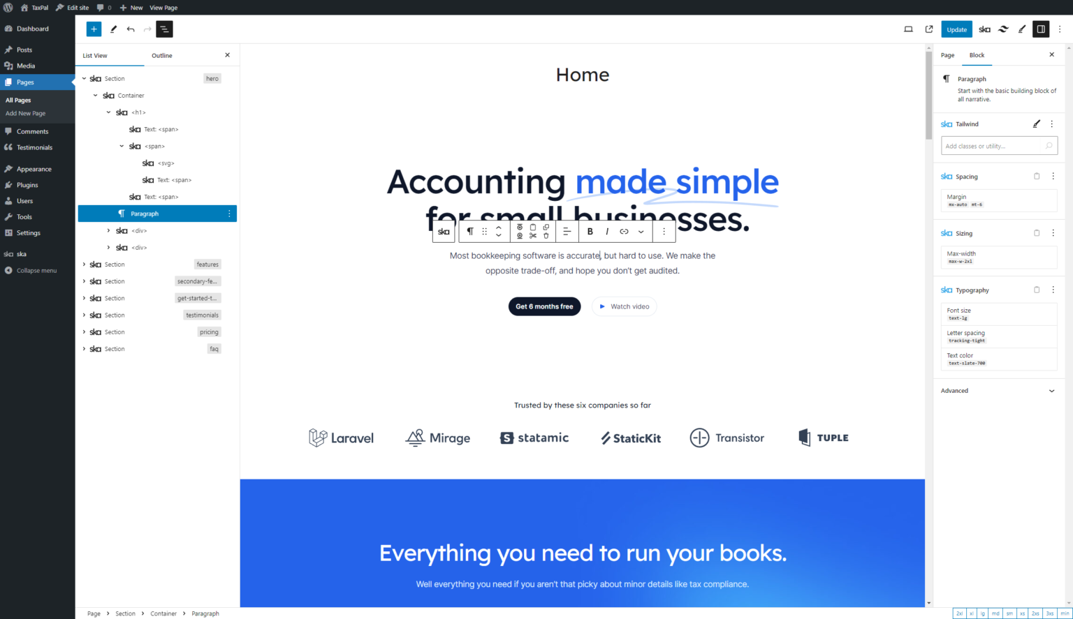 Using ska-blocks isn’t like using a page builder that produces unnecessary markup and loads unused styles – all the HTML elements on the page are the ones that you add and all the CSS is generated from the Tailwind classes you use on that particular page – when multiples of the same Tailwind class are used the CSS for it is only loaded once, producing the leanest possible result.
