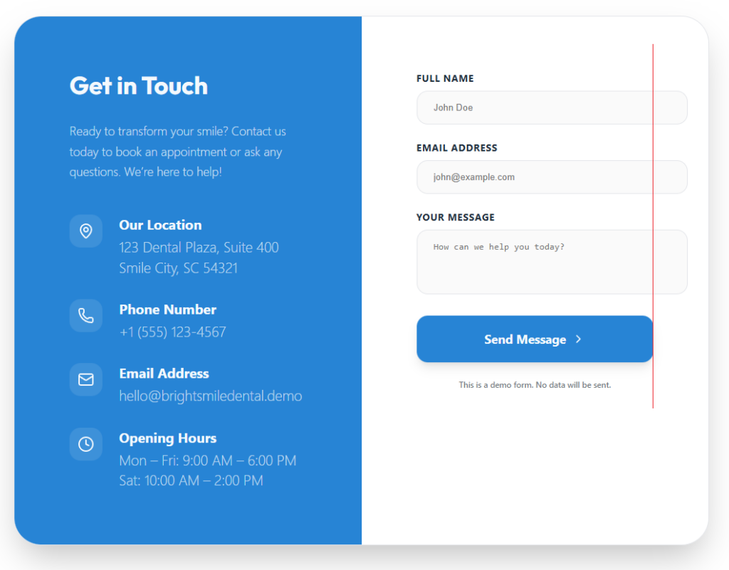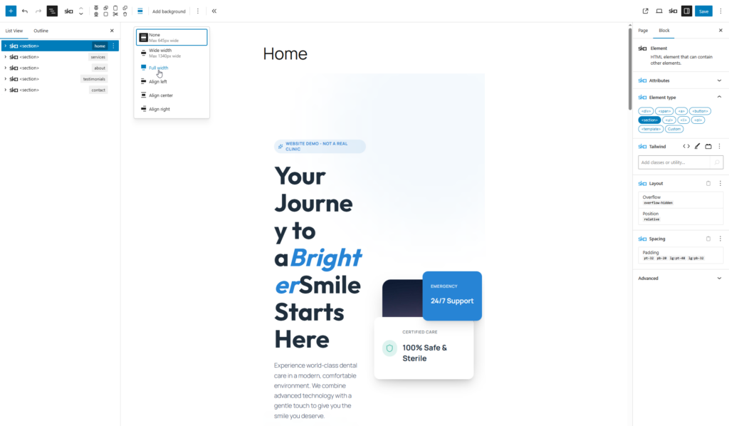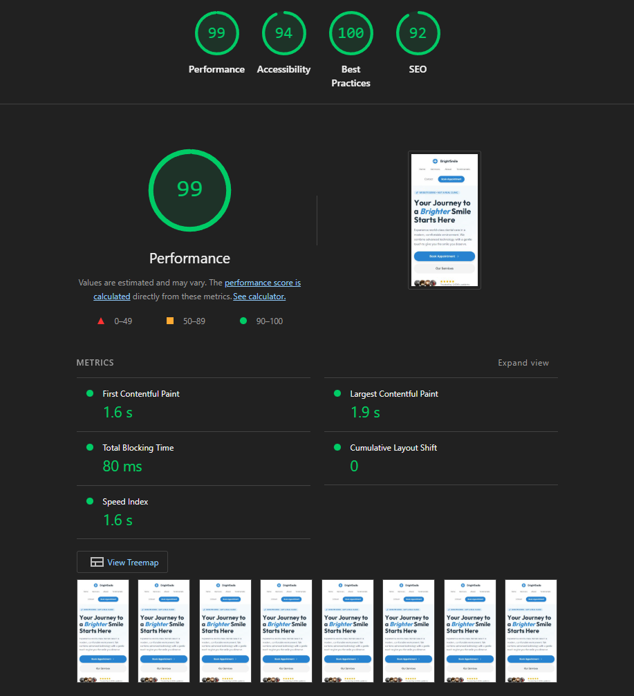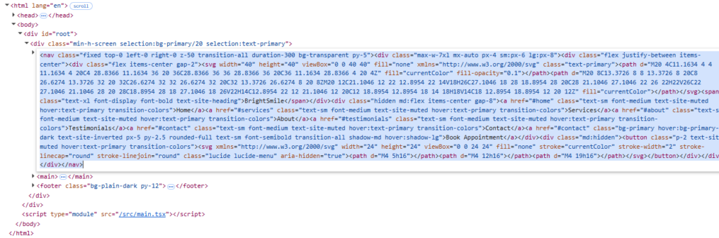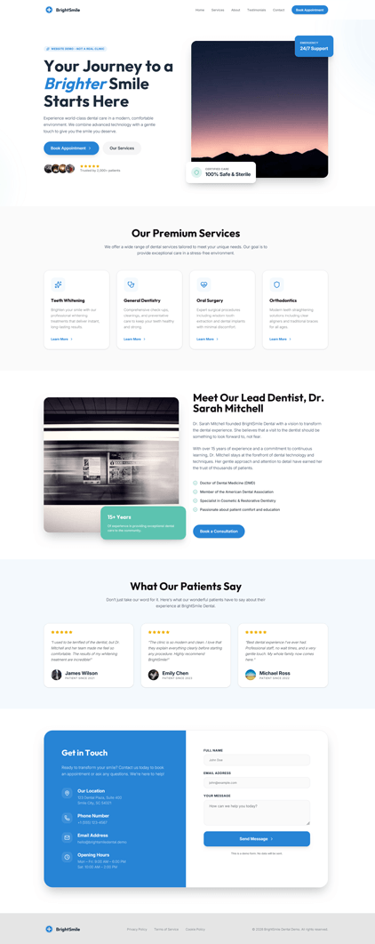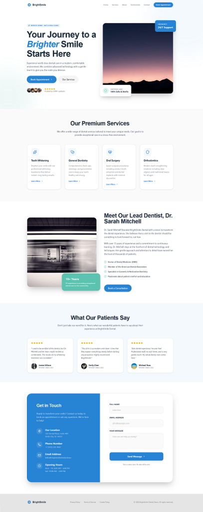 Use realistic placeholder text for a clinic named **"BrightSmile Dental"**, how ever the texts should indicate that this is a website demo and not a real clinic.I didn’t specify whether the site should be HTML-only, using NextJS or anything like that because all we care about is the working result, from which we can grab the Tailwind HTML and pop it into WordPress by using the ska-blocks plugin.