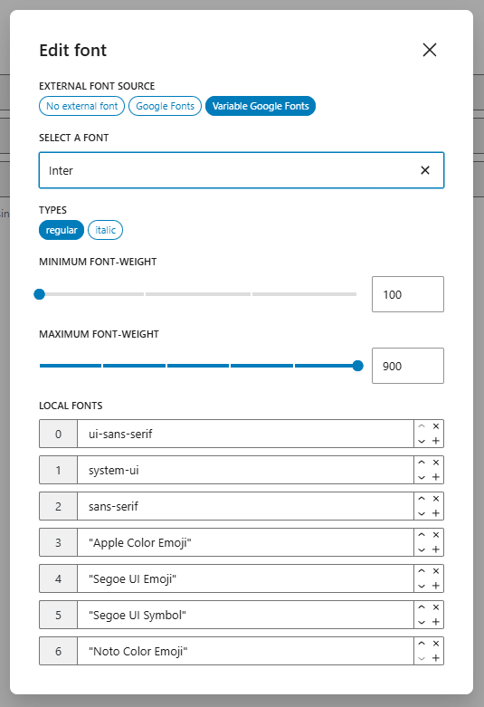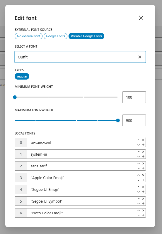 While we’re here, get rid of the default fonts of the Twenty Twenty-Five theme (by clicking on it and unselecting all variants) as we won’t be using these: