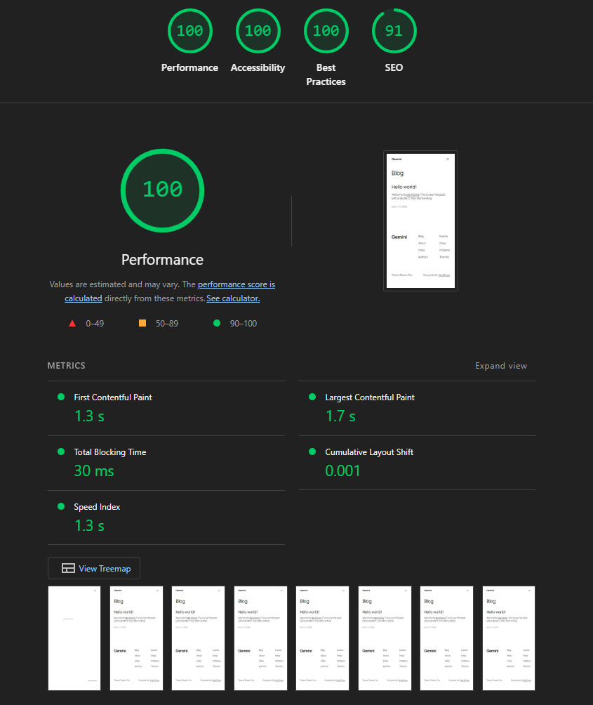 As noted earlier, the blank WordPress site had a perfect pagespeed score with Lighthouse. Having completed the site and applied some basic performance optimizations, the score remains good, meaning we didn’t introduce massive amounts of unnecessary bloat in the process: