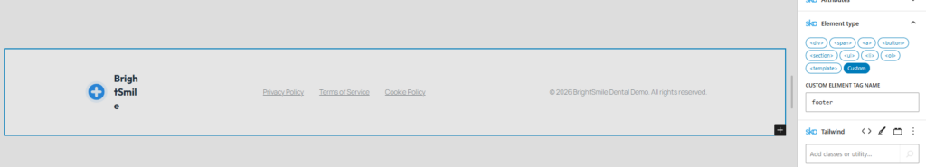 as the WordPress template part that renders the footer will itself use the <footer> element, so the Element type can be changed to a <div>. Also added whitespace-nowrap to logo text: