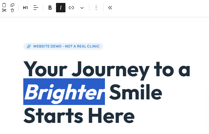and insert a Heading block, set its’ heading level to H1 and add the previously copied classes to it, as well as the full contents of the text “Your Journey to a Brighter Smile Starts Here”. Next, select the word “Brighter” and make it italic (Ctrl + i):