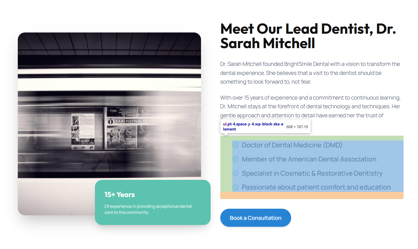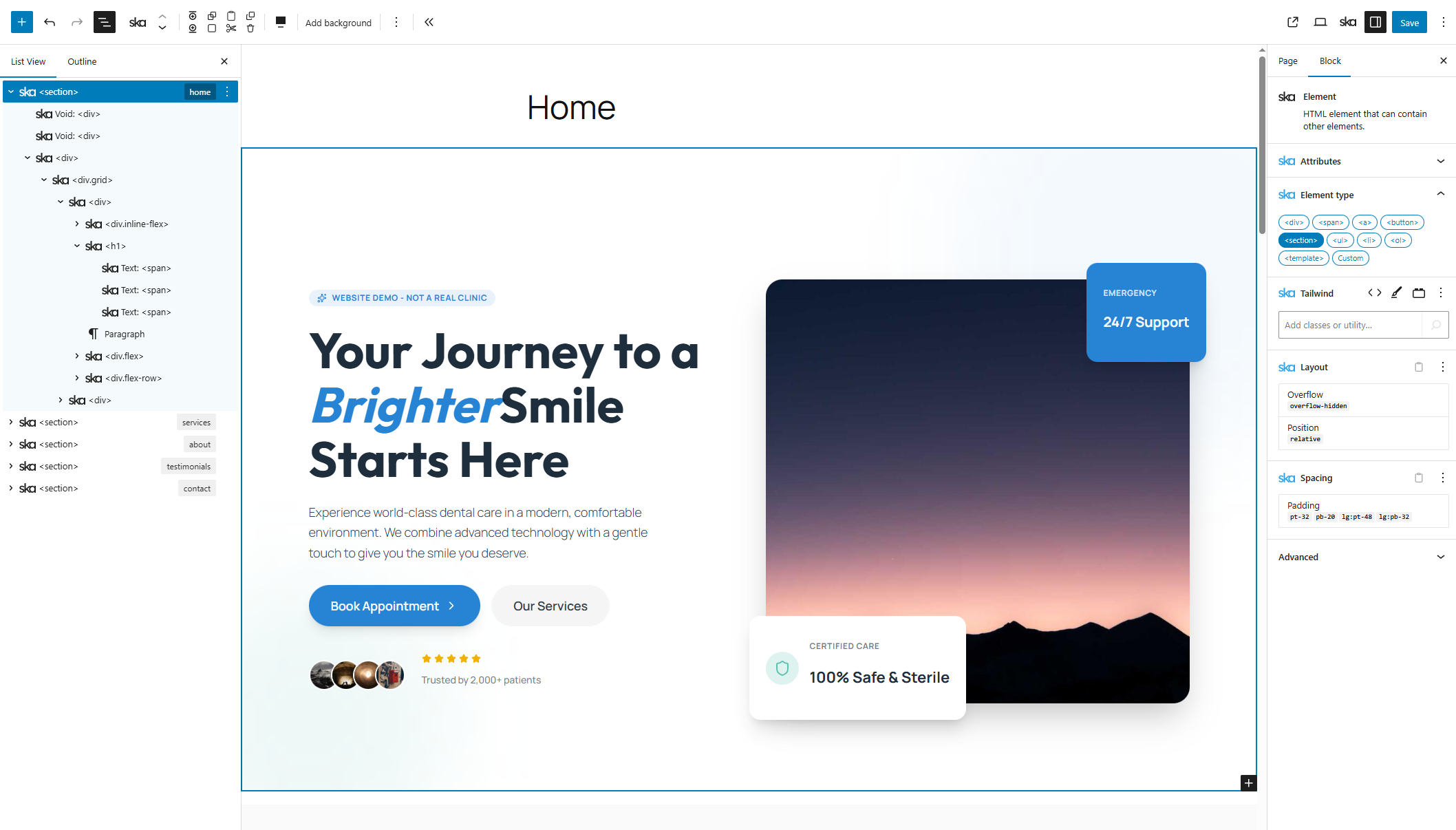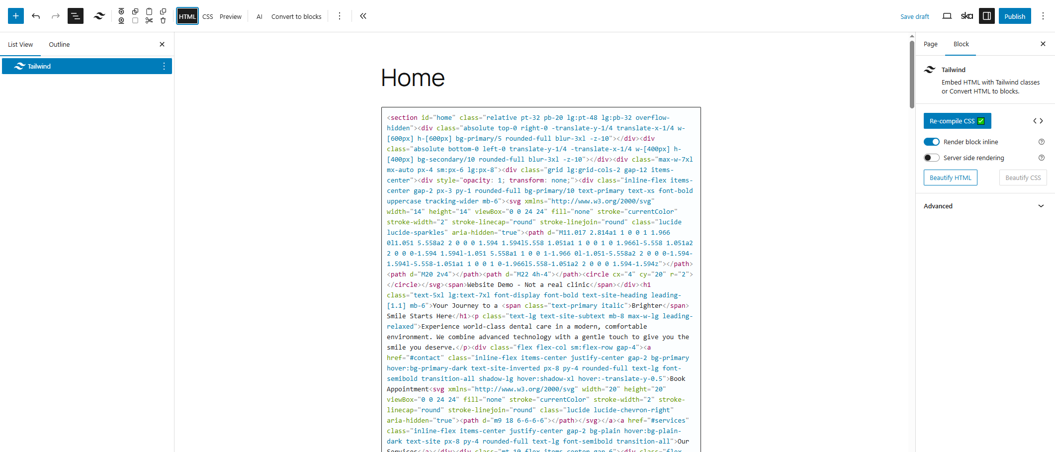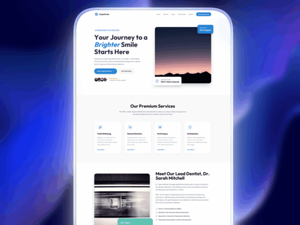 Use realistic placeholder text for a clinic named **"BrightSmile Dental"**, how ever the texts should indicate that this is a website demo and not a real clinic.I didn’t specify whether the site should be HTML-only, using NextJS or anything like that because all we care about is the working result, from which we can grab the Tailwind HTML and pop it into WordPress by using the ska-blocks plugin.