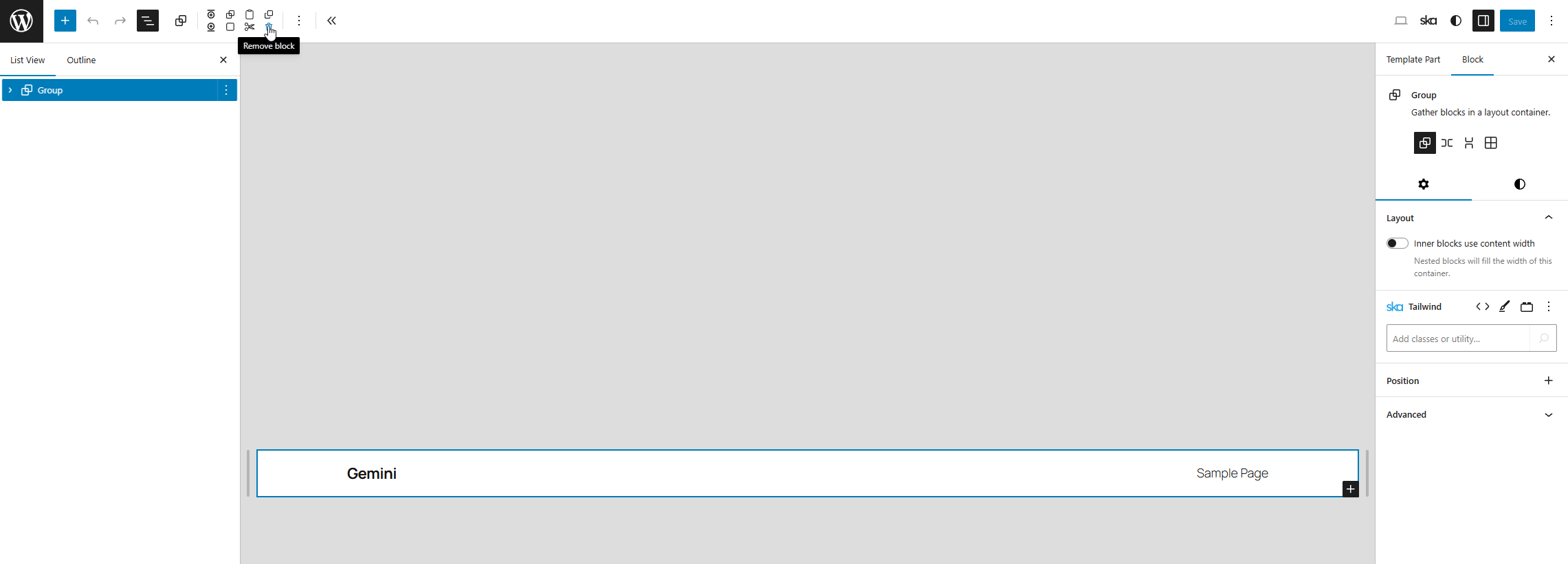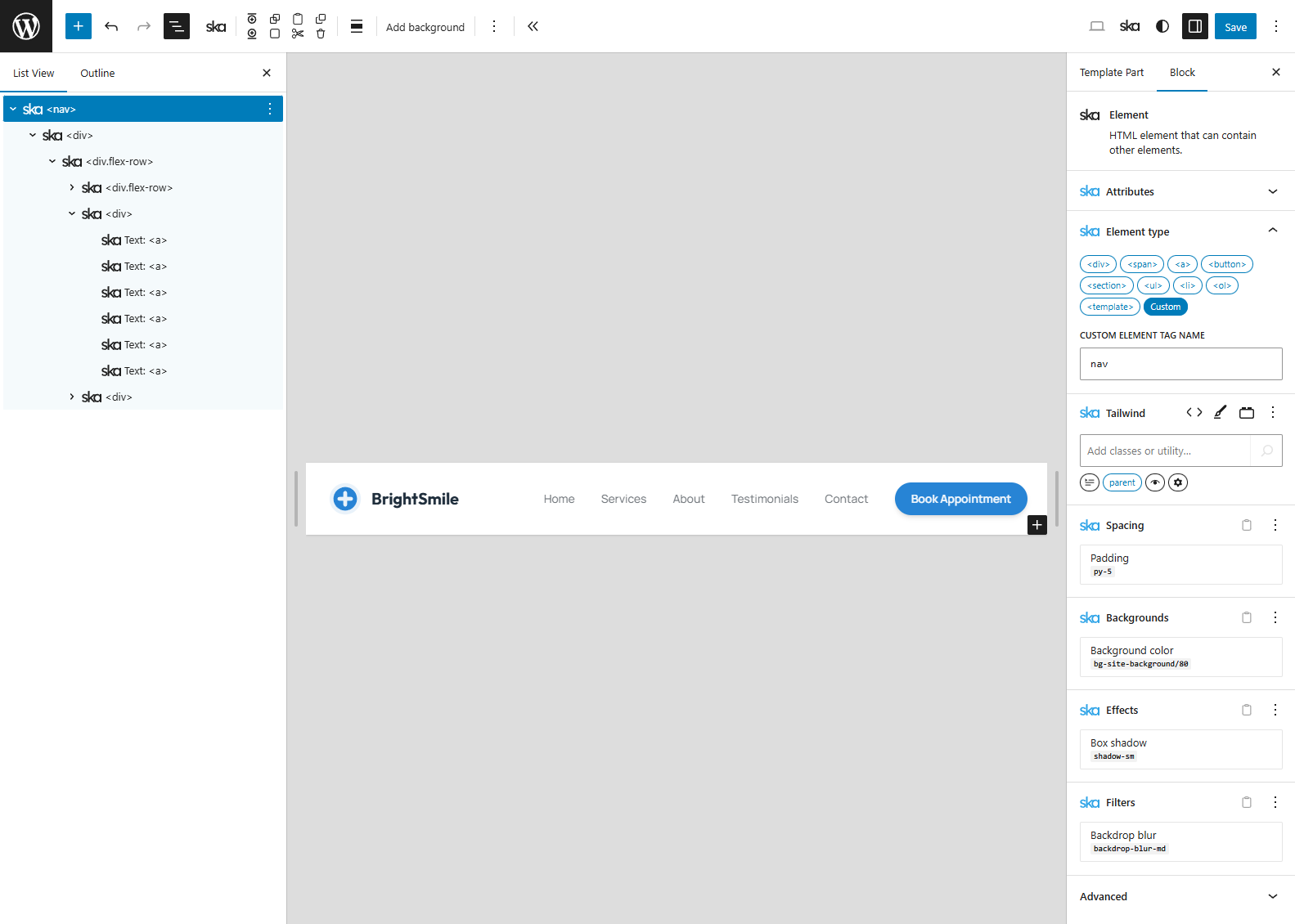 }Sticky header – we don’t want the header to be fixed as it renders badly in the editor. Instead, let’s make the header sticky with the following Tailwind classes: parent:sticky parent:top-[var(--wp-admin--admin-bar--height,_0px)] parent:z-50. The parent: variant (custom variant added by ska-blocks plugin) applies the CSS rules to the header’s parent element which is going to be the block that renders this template part.