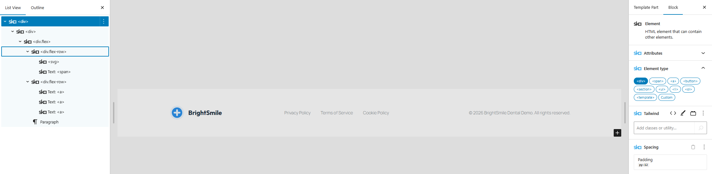 as the WordPress template part that renders the footer will itself use the <footer> element, so the Element type can be changed to a <div>. Also added whitespace-nowrap to logo text: