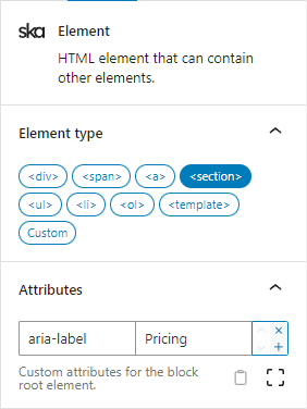 In combination with a custom tag name, custom attributes and any Tailwind classes, the Element block can be used to create almost anything you could normally write manually in plain HTML.