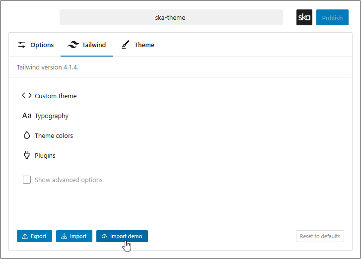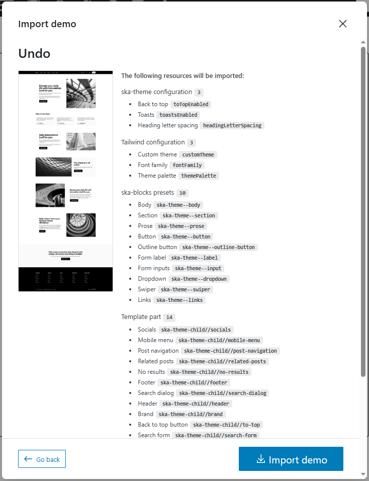 Demos are a fast starting point for a website with a particular appearance or style. They include customizations to ska-blocks, ska-theme configurations, Tailwind theme, modifications to presets and sample pages.