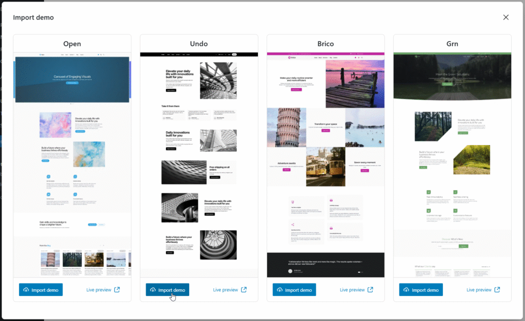 Select the desired demo and hit “Import demo“: