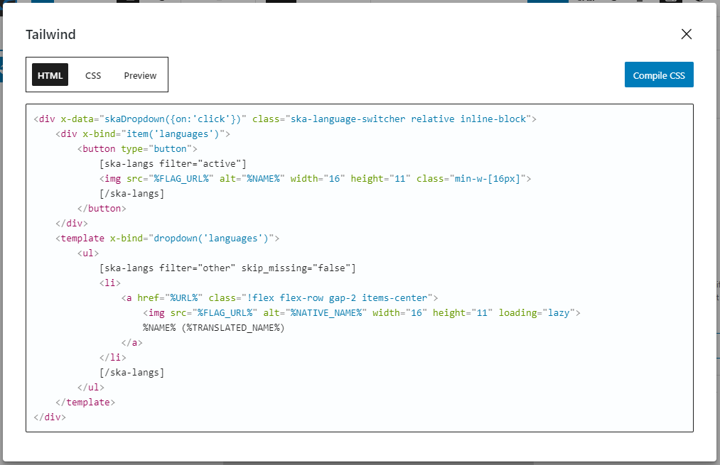 Complicated language switcher in a modal Beautify HTML/CSS – The block also features buttons for quickly formatting the HTML or CSS code that has been inputted.