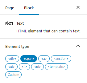 By default the HTML tag name span is used, but it can be changed using the Element type block controls: