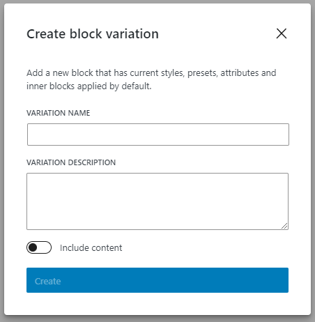 When not enabling the Include content option, values from Rich Text inputs are blanked. The child blocks of the block you’re creating a variation from are still included.