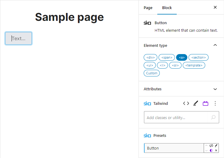 For example the Button block that comes with ska-theme, is actually not a block, but a variation of the Text block with the tag name <a>