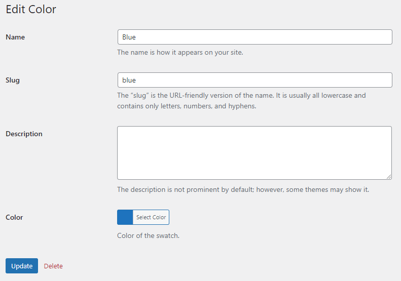 When the type is “color”, you’ll be able to select a color when editing product attribute terms: