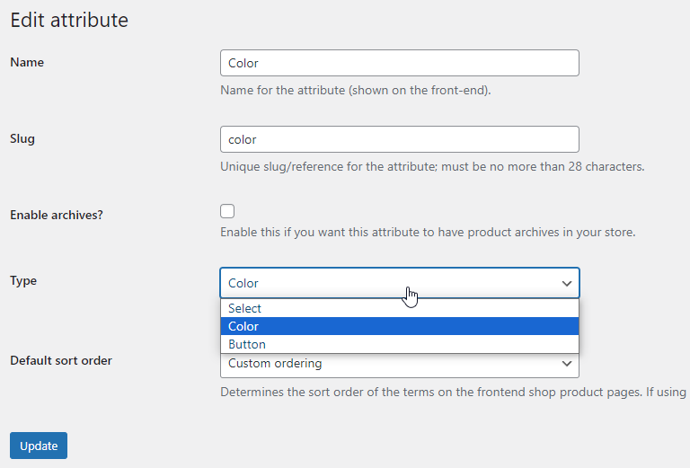Once enabled, when navigating to Products -> Attributes and editing a product attribute, you’ll be able to select its’ type: